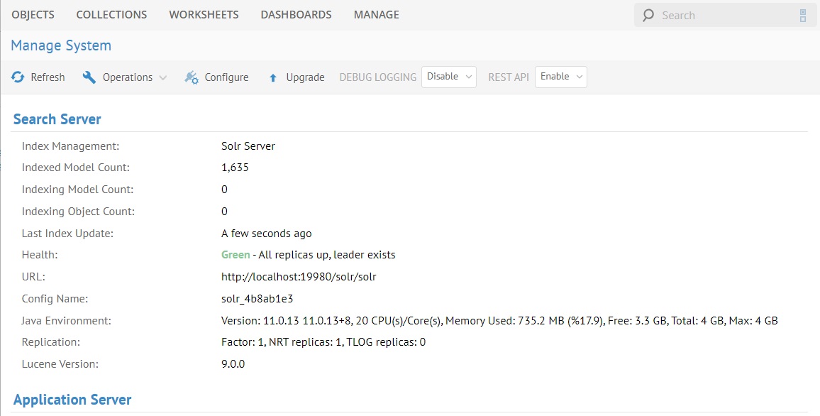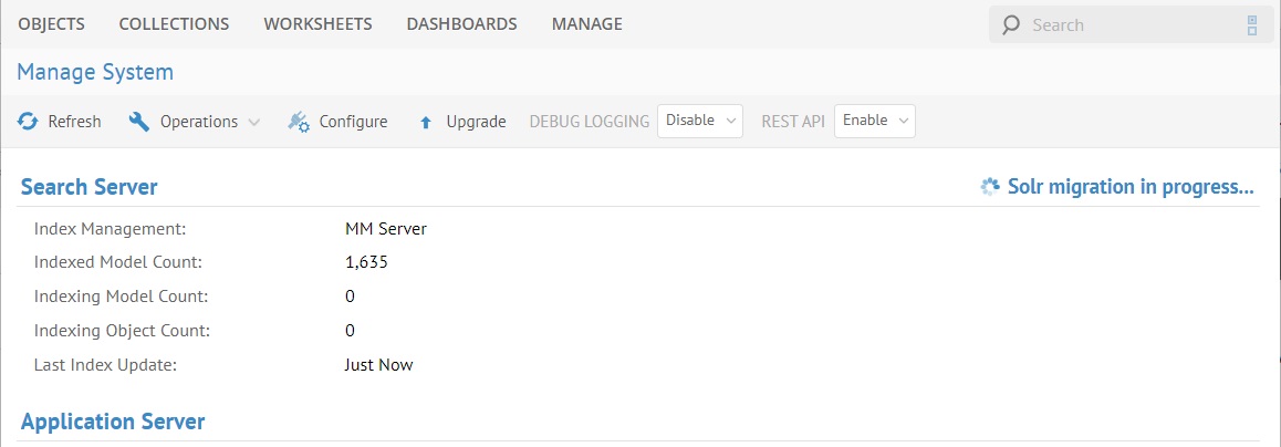 $MM_HOME/data/log/tomcat/catalina.logsuch as:[migrateIndex] (System) SEARCH_I0061 Solr core at http://localhost:11480/solr is started. Solr is running in the solr_4b8ab1e3 collection. [migrateIndex] (System) SEARCH_I0019 Search index is not found. Creating a new search index... [migrateIndex] (System) SEARCH_I0006 Deleting index for model [-1,-1]. [migrateIndex] (System) SEARCH_I0068 Migrating the Lucene index to Solr: Total models 342. Models already migrated 1. Models to be migrated 341. [migrateIndex-4] (System) SEARCH_I0070 Migrating model [801,1] to Solr. [migrateIndex-3] (System) SEARCH_I0070 Migrating model [799,1] to Solr. ...[migrateIndex] (System) SEARCH_I0069 Finished migrating the Lucene index to Solr. - Check that the Search Server section of MANAGE > System indicates Solr migration in progress and then the Solr Server details once the migration is completed.