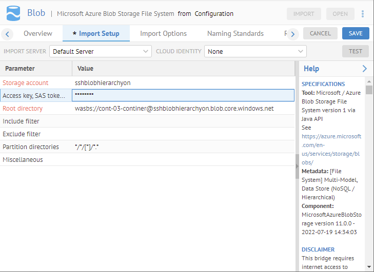 Leave the Access key, SAS token, or MSI Tenant-ID/Client ID bridge parameter empty and continue with the import.