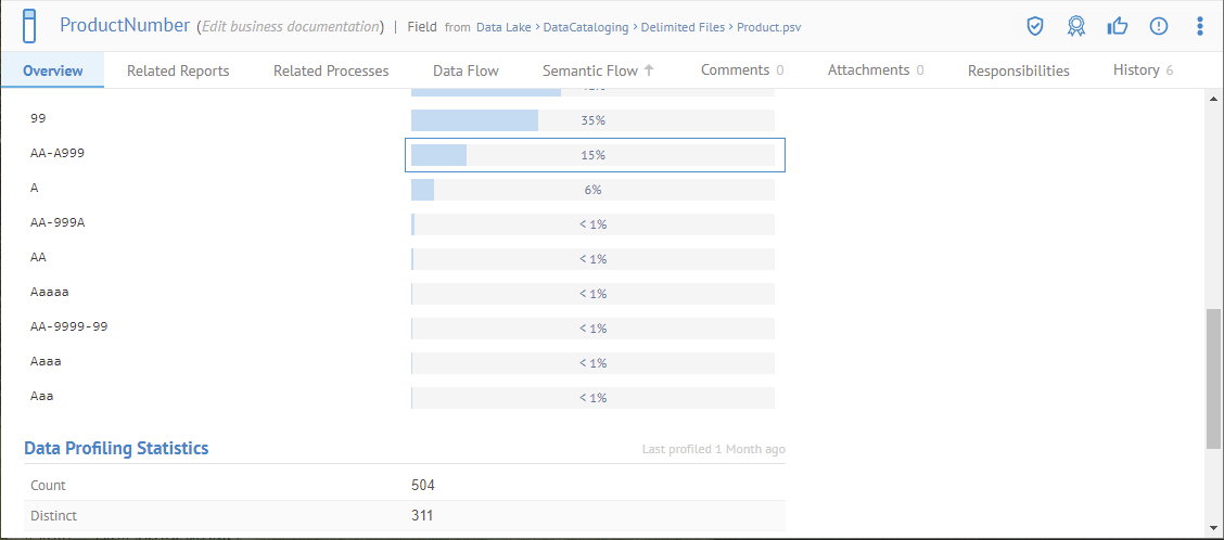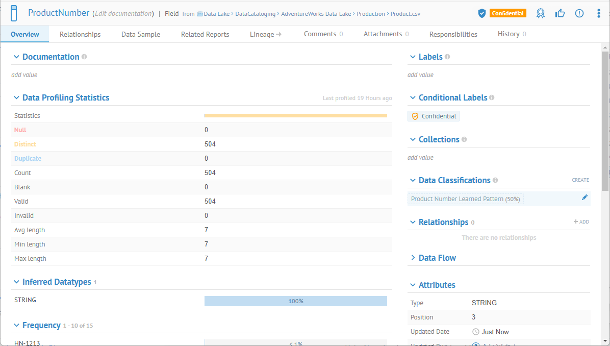 Search for ProductNumber and pick the one in the Data Lake > DataCataloging > AdventureWorks Data Lake > Production > Product.csv file. Open its object page Overview tab and manually assign the Product Number Learned Pattern data class to ProductNumber.