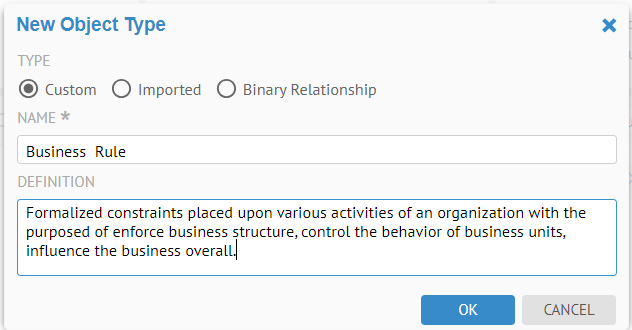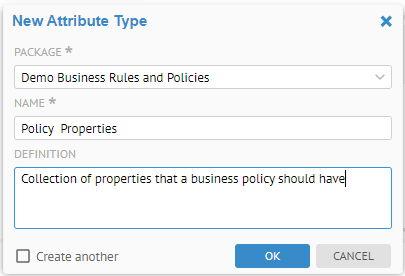 Enter "Policy Number" in the NAME and "Unique identifier for a business policy valid across all business unites." in the DEFINITION. Then click OK.