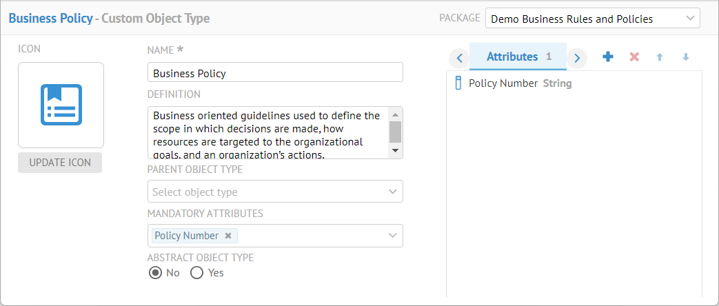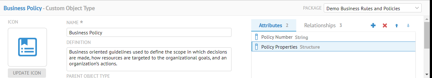 Specify Demo Business Rules and Policies as the PACKAGE.