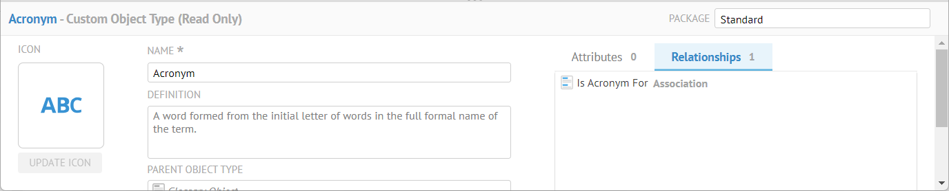 The product comes with the Standard package. The standard package is special. It contains types that cannot be renamed, removed from the standard parent, or deleted from the metamodel. The product relies on the presence of these types for its functionality. You can extend standard types by adding new attributes and objects to them.