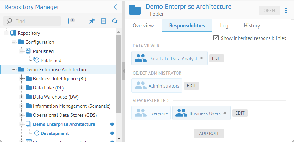 Select the Demo Enterprise Edition folder and the Responsibilities tab.