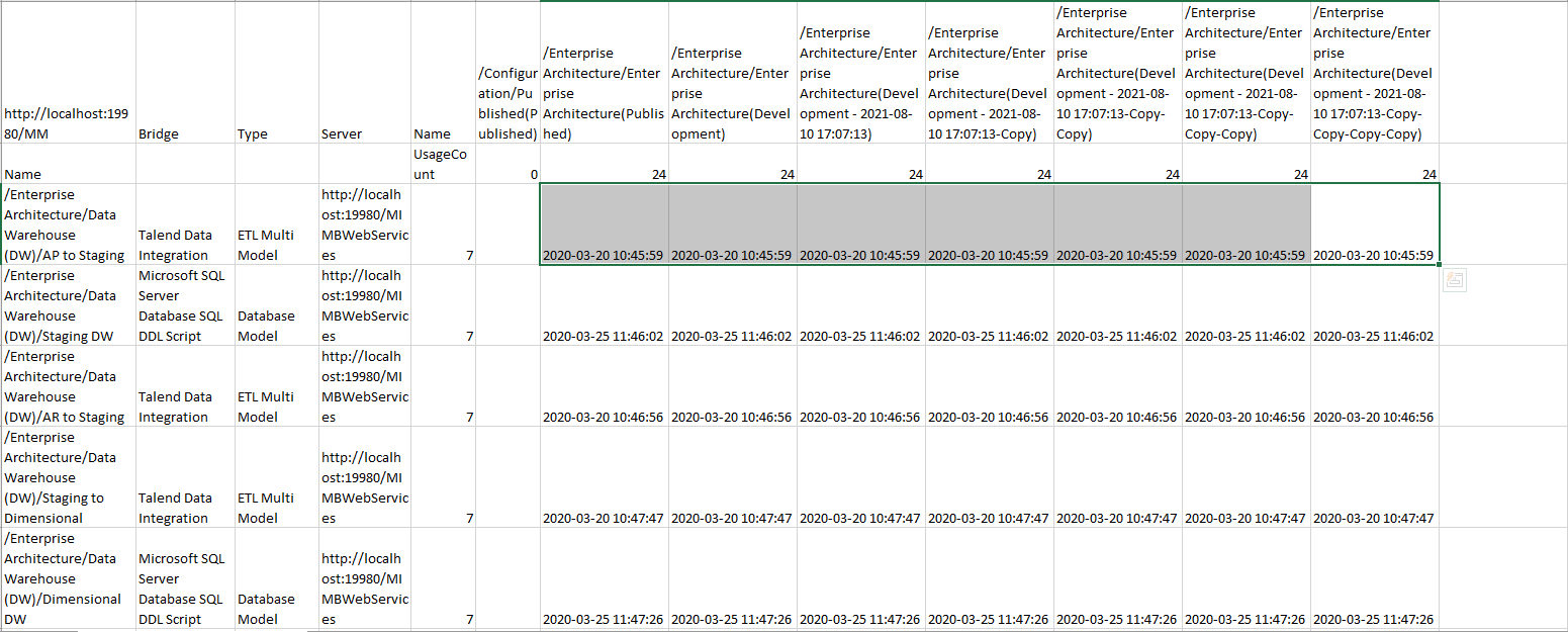 In this case we can see that there are 7 versions of the Demo Enterprise Architecture configuration, but that all of them have the same versions of the models and are thus superfluous and only the Development and Published versions are required at this time.
