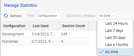 Go to MANAGE > Statistics and specify Configuration in the TYPE.
