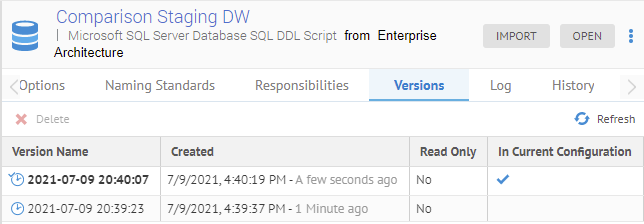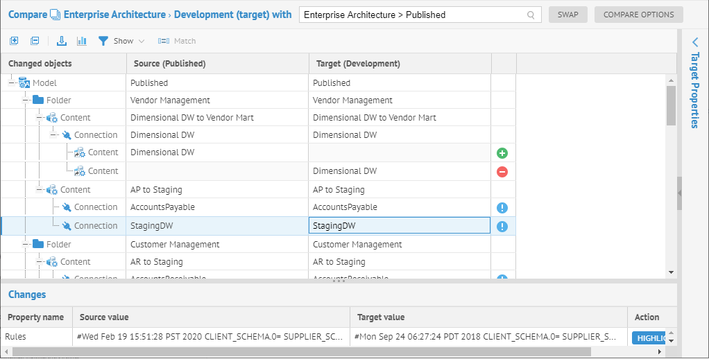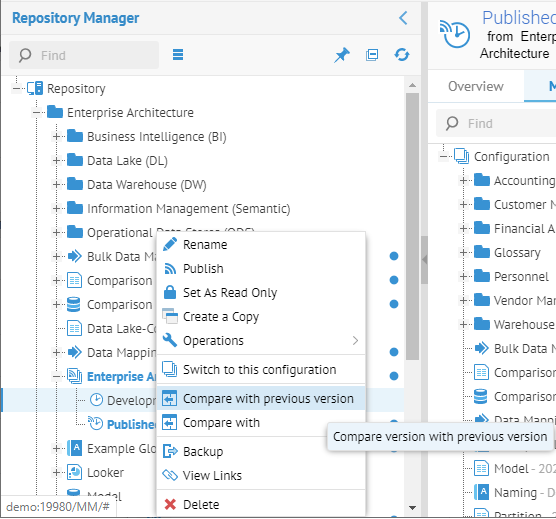 Go to MANAGE > Repository, expand the Demo Enterprise Architecture configuration, right-click the Development version, and select Compare with previous version.