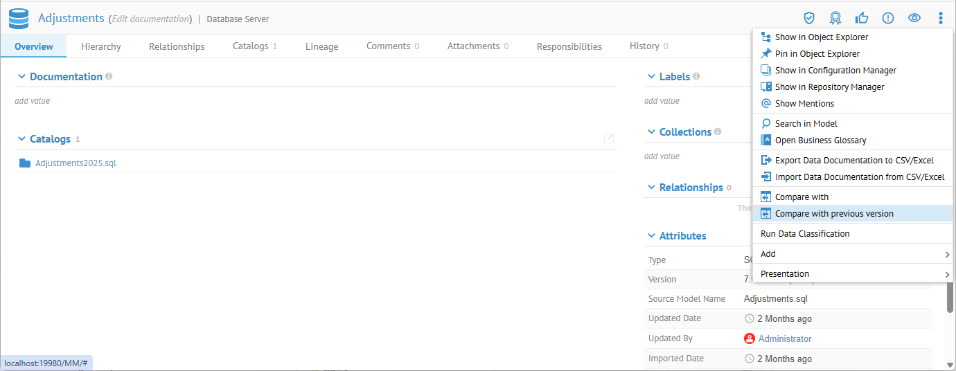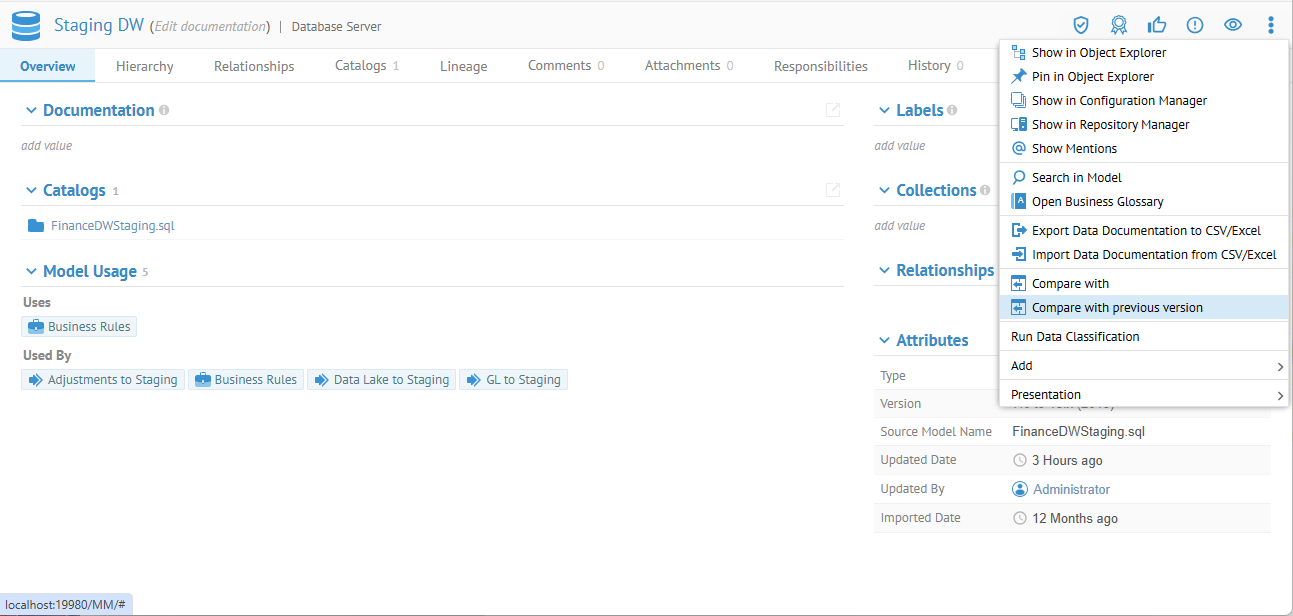 Or one may select a version of a model in the Repository Panel where you want the model to be located, and select Compare with Previous...