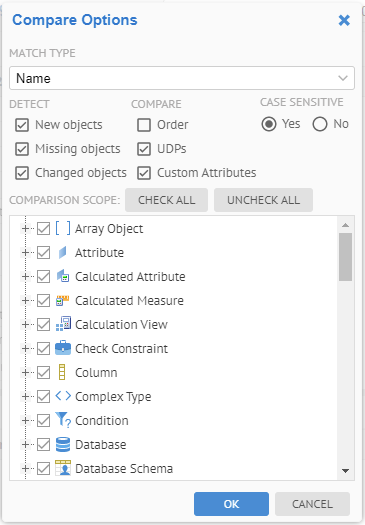 In many cases there are expected differences between models, e.g., a difference in schema name, that one wishes to ignore and continue the comparison as if the actually matched (had the same name). You may use the Match option to inform the comparator that they should be treated as equivalent and thus perform the comparison on the contained objects (e.g., tables in the schema).