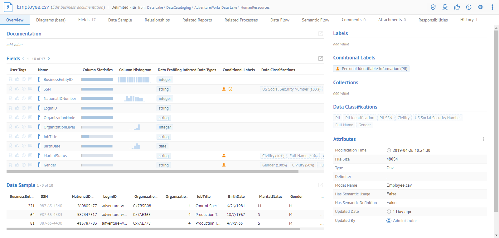 Dan cannot see data profiling and sampling information for fields which are labeled as Confidential as this sensitivity label includes data hiding.