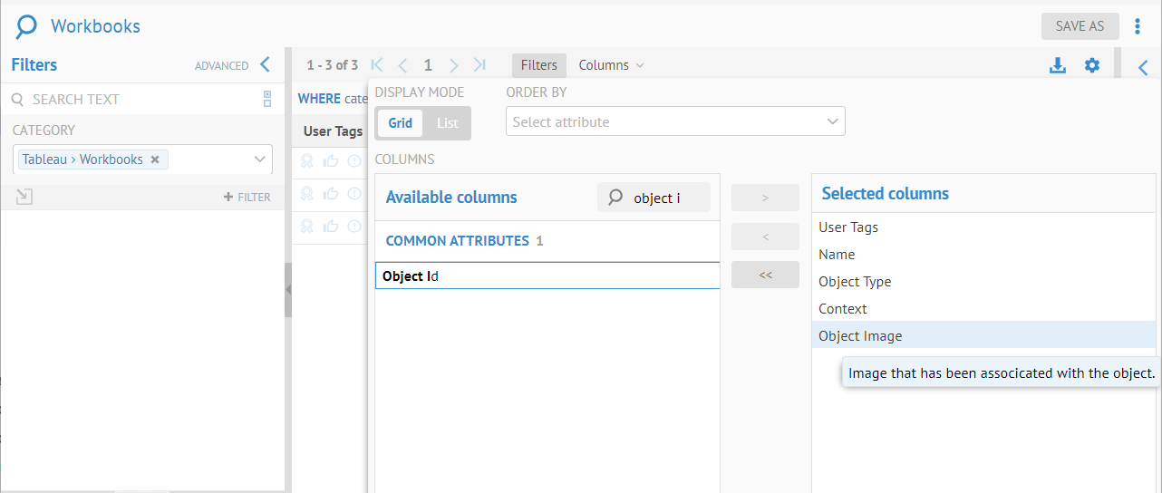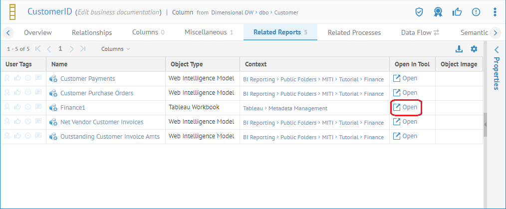 Some objects may be opened on from the original tool. The typical use case is for Business Intelligence (BI) tools on where a report object can be opened in the original tool. This is the case of a Tableau Worksheet where users can Open In Tool at various locations such as: