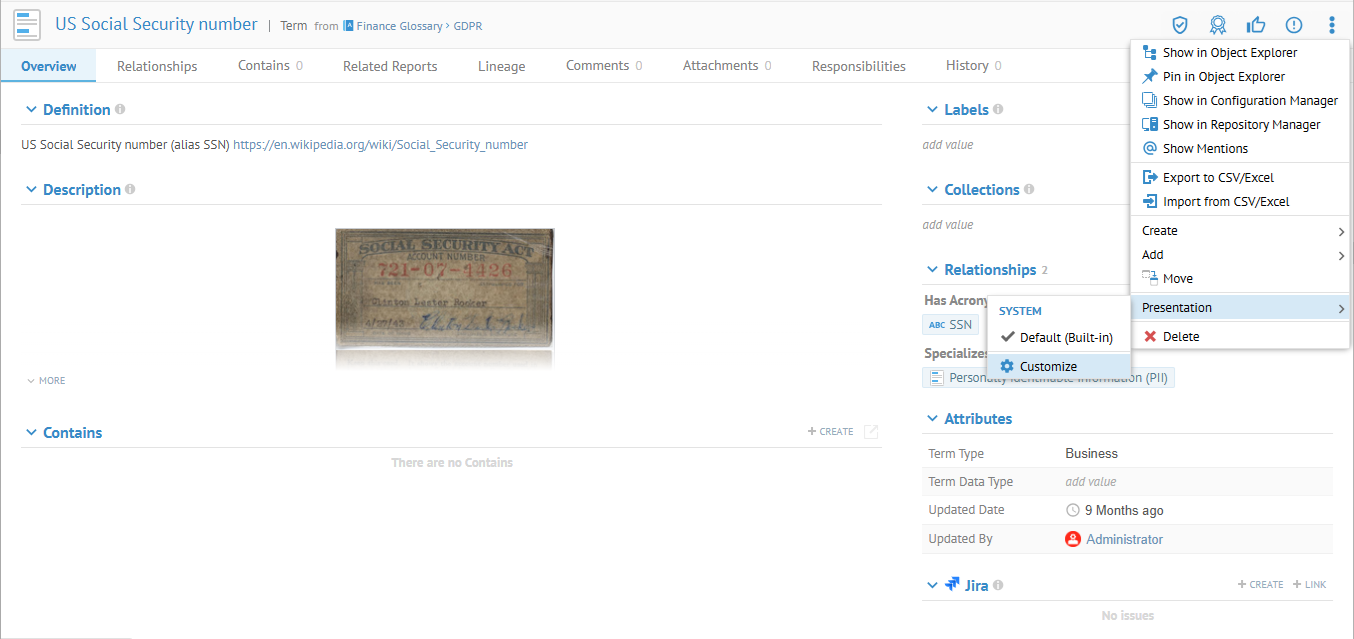 Along with customizing the layout of the Overview tab of the object page, you may also control whether a particular tab is shown or not (hidden) in a particular presentation.