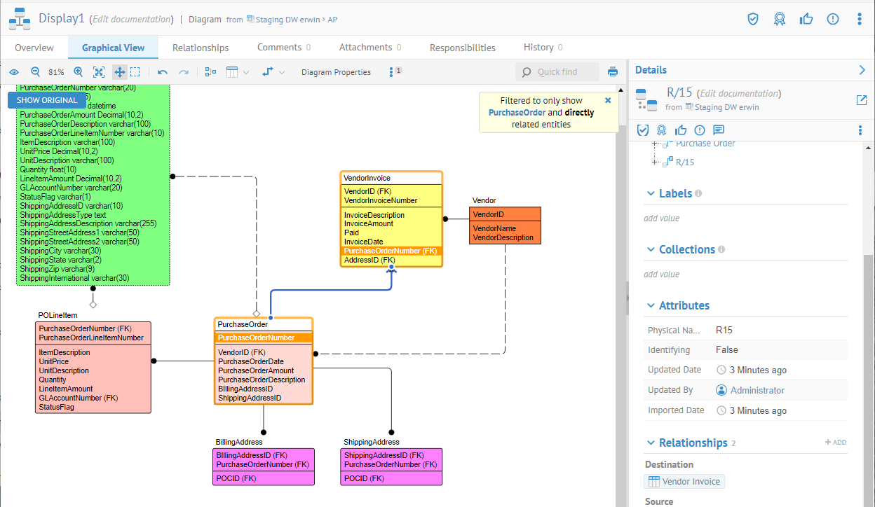 In some cases there is little to do as some databases will already have a very complete set of primary/foreign key relationships defined and thus this information is harvested as relationships in the model, such as the first one above between the PurchaseOrder and Vendor tables. Again, these are allowed by the metamodel.
