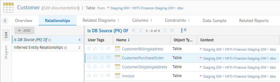 In this case we will navigate to the object page of the Customer table in the Staging DW database model, and click the Relationships tab.