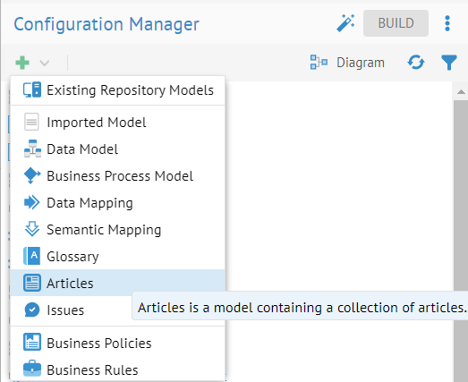 To create articles you must create a custom model for them to be contained in. You may create any number of these models to contain various collections of articles. You create a custom model just as you would a glossary by creating a model in a folder in the repository and including it in configurations.