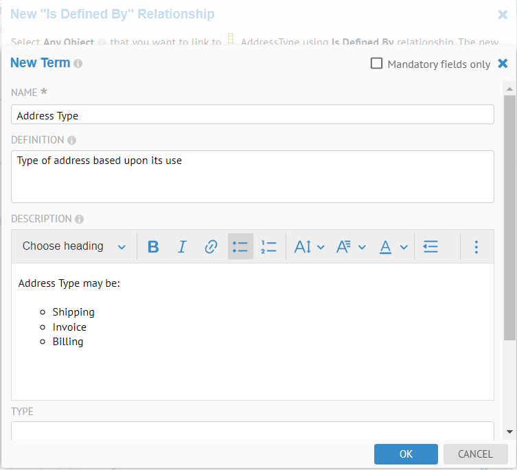 In this scenario you will enter an explicit local Name and Business Definition, overriding the reused Name and Business Definition from a term in a glossary.