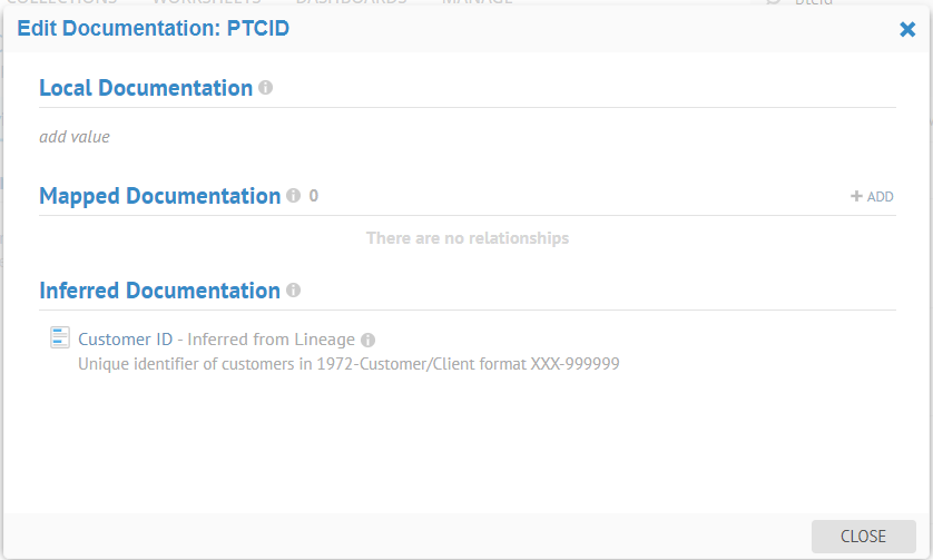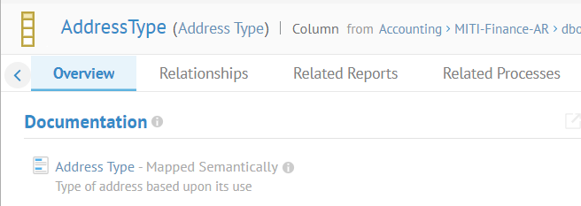 You may edit the Local Documentation directly here, create a Mapped Documentation relationship from an existing term or other object or a new one you create from this information, see the Inferred Documentation links including search matching terms if available.