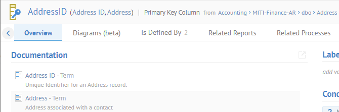 The object is now locally documented, but by re-using business name and definition for other objects (terms in this case).