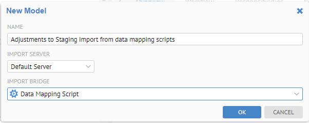 Sign in as Administrator and create a new model named "Adjustments to Staging import from data mapping scripts". It should use the Data Mapping Script import bridge.
