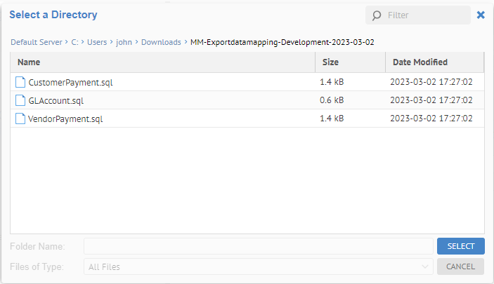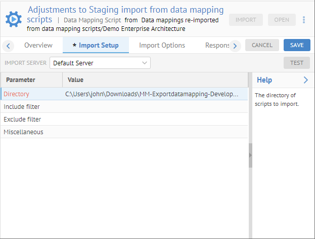 Go to the Import Setup tab and browse to the location of a directory containing the data mapping scripts (uncompressed) to import and click SAVE.
