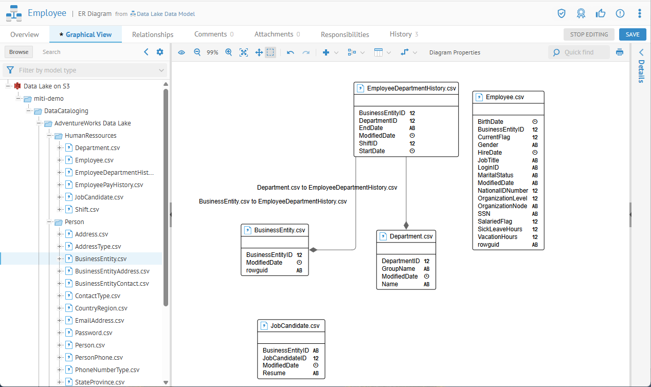 Click STOP EDITING and then click SAVE to save the diagram and then right-click BusinessEntity.csv and select Open and go to the Relationships tab.