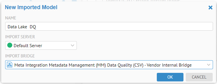 So, import the data quality model to be named "Data Lake DQ" using the Meta Integration Data Quality import bridge.