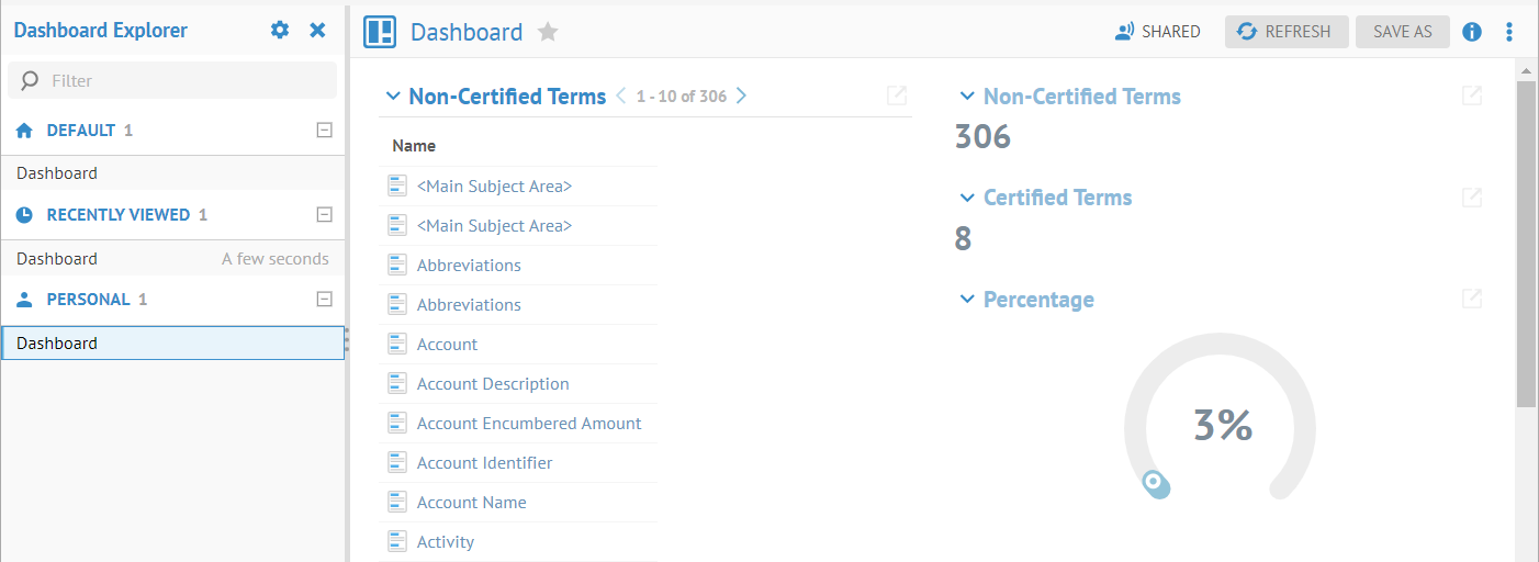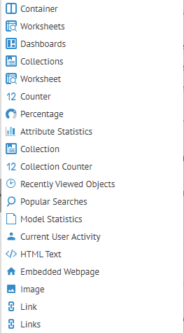 Dashboards are a way for you to completely customize the content presented on a page in MetaKarta. They have full BI reporting dashboard capabilities (tile layout, widgets for containers, numbers, statistics such as grids, bar or pie charts, etc.), but apply to the metadata in the repository, and are based upon Metadata Query Language (MQL) along with worksheets and collections.