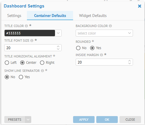 - Pick one of the PRESETS to define Settings, Container Defaults and Widget Defaults