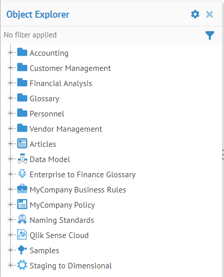 You may specify a persona (e.g., All Objects or Data Inventory) in the pull-down to the left of the search box to set the basis or scope with initial filtering of objects in the explore tree.