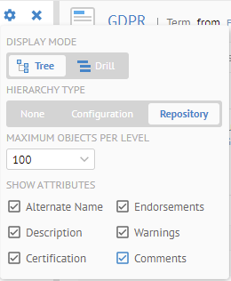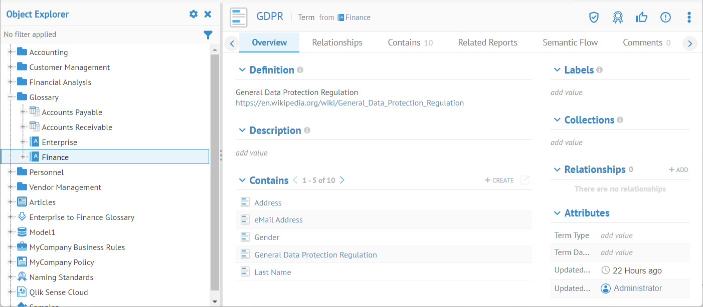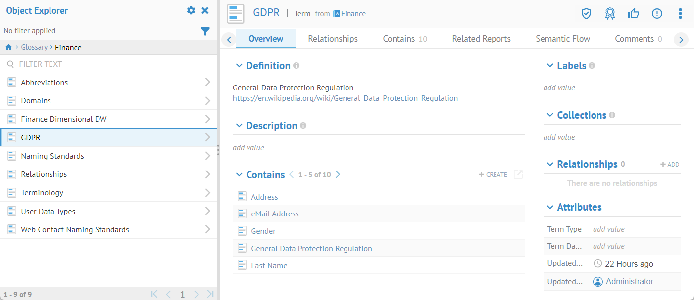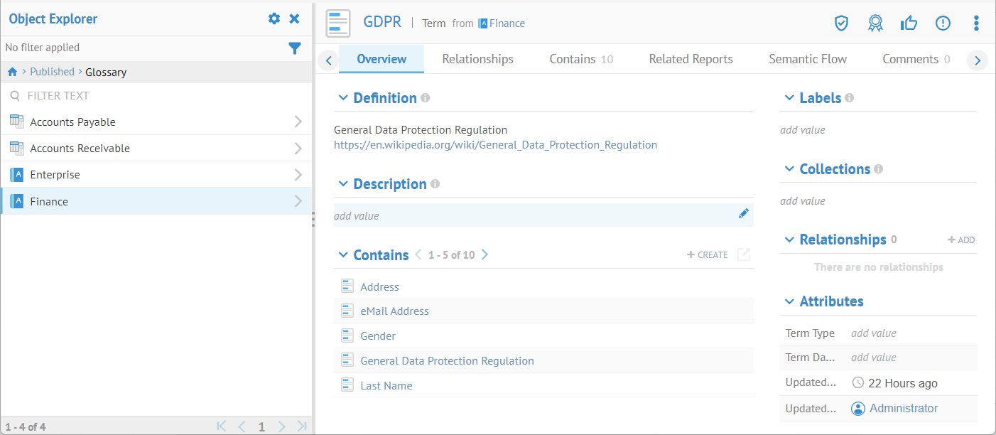 Click the GDPR term in the object page. Here, we navigate to the GDPR term, but the Object Explorer panel does not update to GDPR.