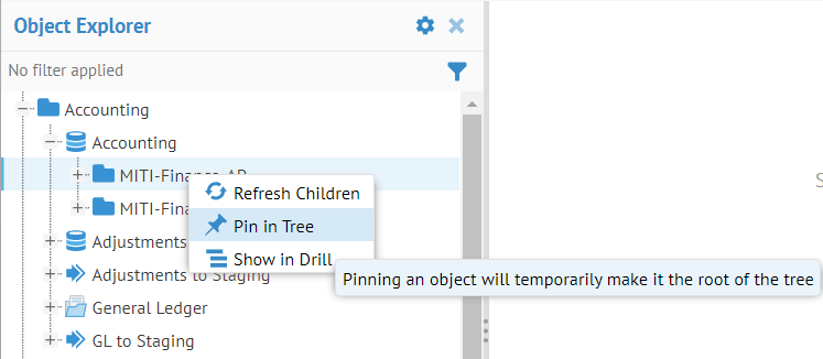 Go to OBJECTS > Explore. Navigate to the MITI-Finance-AP level in the tree and right-click the object and select Pin in Tree.