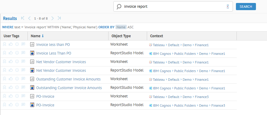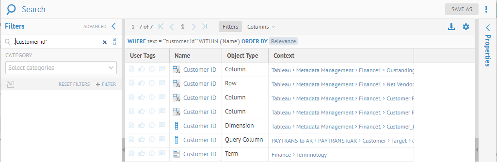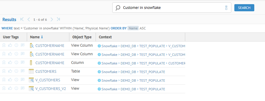 The results have changed, as the Data Inventory persona pre-filters the results, where All Objects did not. With the Data Inventory persona selected, only columns and tables (or their equivalent) are displayed, whereas we saw relationships, etc., with All Objects.