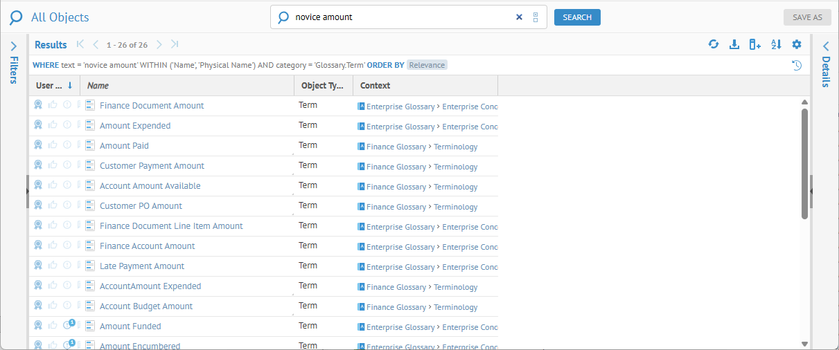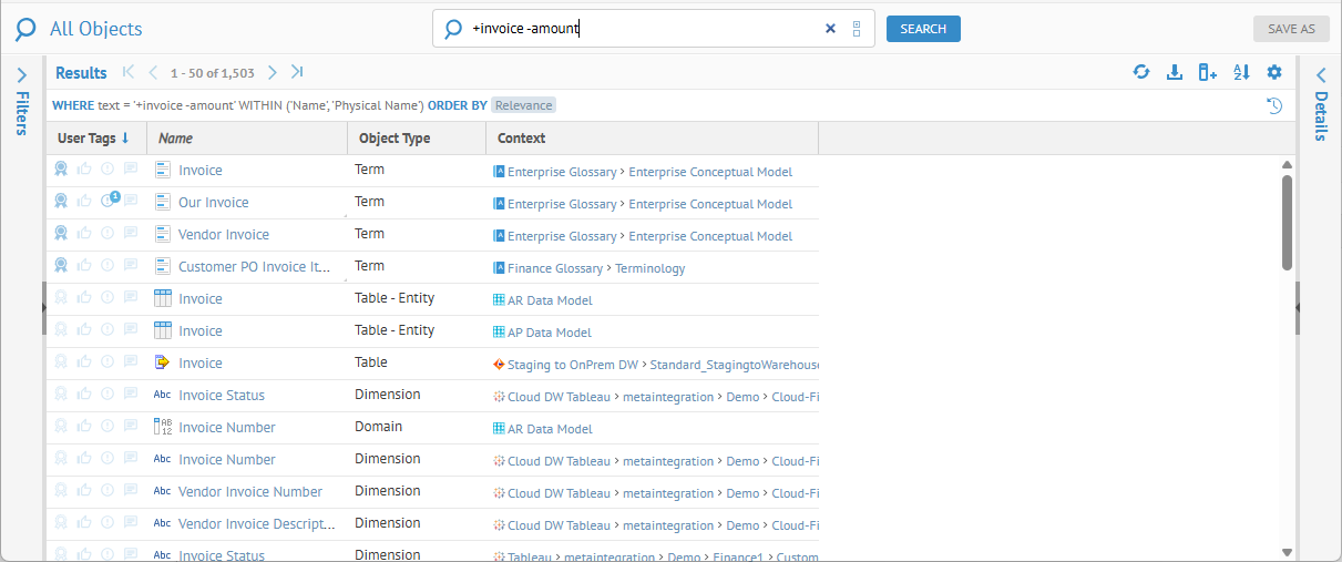 You may specify a persona (e.g., All Objects or Data Inventory) in the pull-down to the left of the search box to set the basis or scope with initial filtering of the search results and explore results.