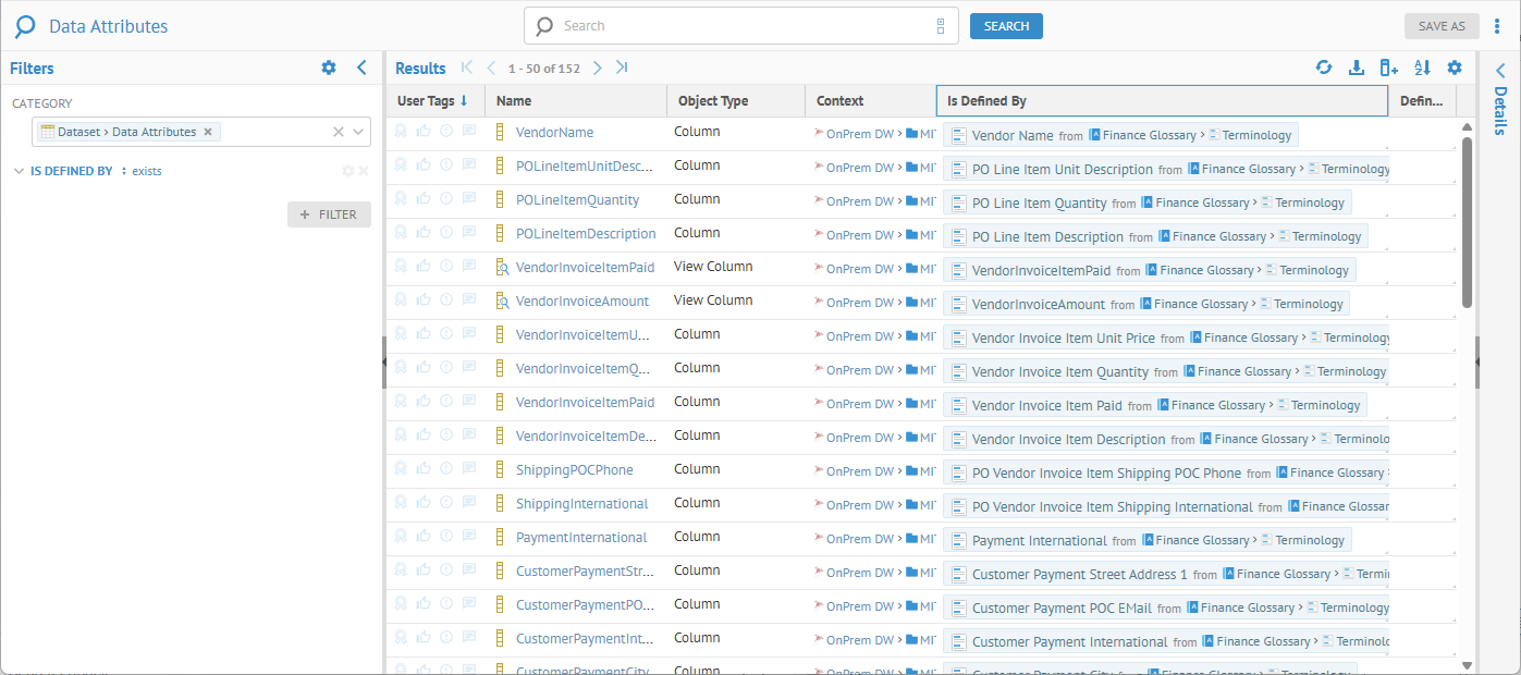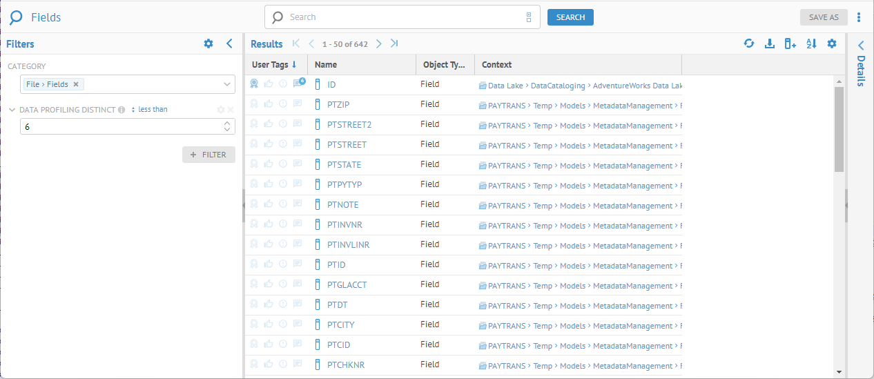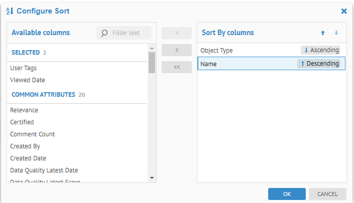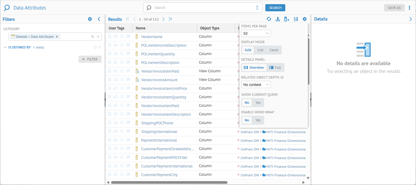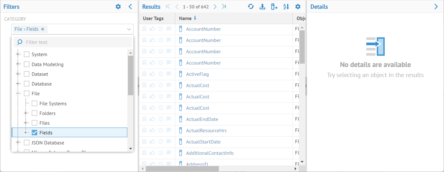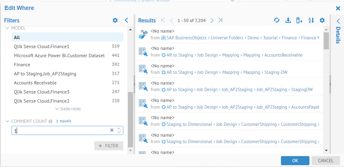The worksheet capabilities offer you the ability to select multiple object types (e.g. database / tables + Flat files) and subset by model (My Data lake + Sales DW database) before drilling down with a large number of filters: