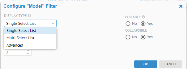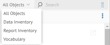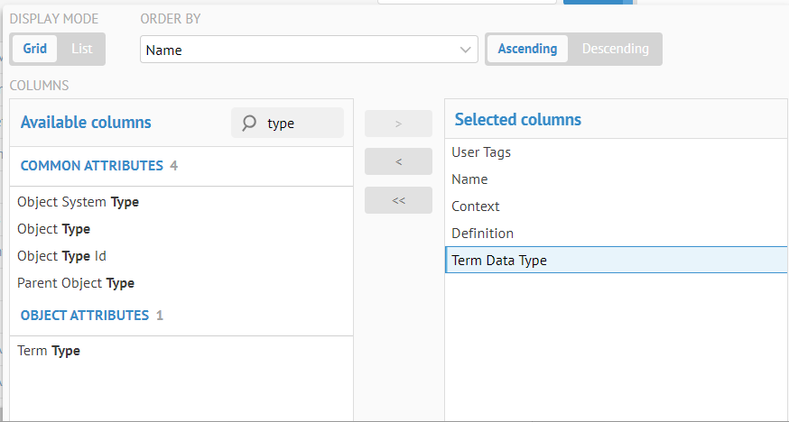 DISPAY MODE to toggle among the List mode (with name and definition) the Grid mode (allowing multiple header columns and sort order by column) and the Card mode (individual cards for each object along with property values for each header column)