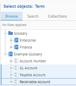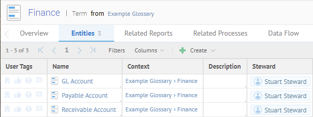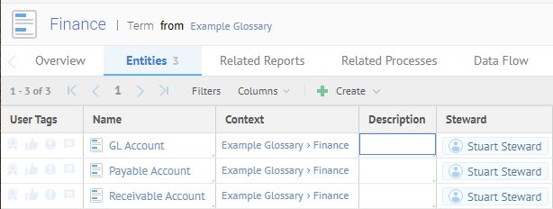 Returning to the new terms created inside the Finance domain (term), sign in as Administrator and Navigate to the Finance term object page in the Example Glossary. Then go to the Entities tab.