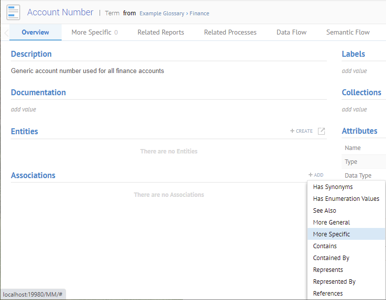 Sign in as Administrator and navigate to the object page of the term Account Number in the Example Glossary. Then click the Add plus sign in the Associations section.