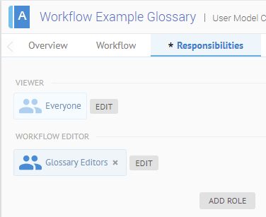 Sign in as Administrator and go to MANAGE > Configuration. Select the Workflow Example Glossary. Go to the Responsibilities tab.