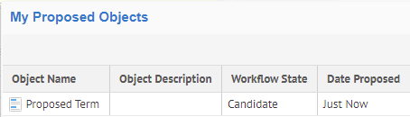 The proposed object starts out as a Candidate and will not be visible to the user who proposed the term in any other way Published.
