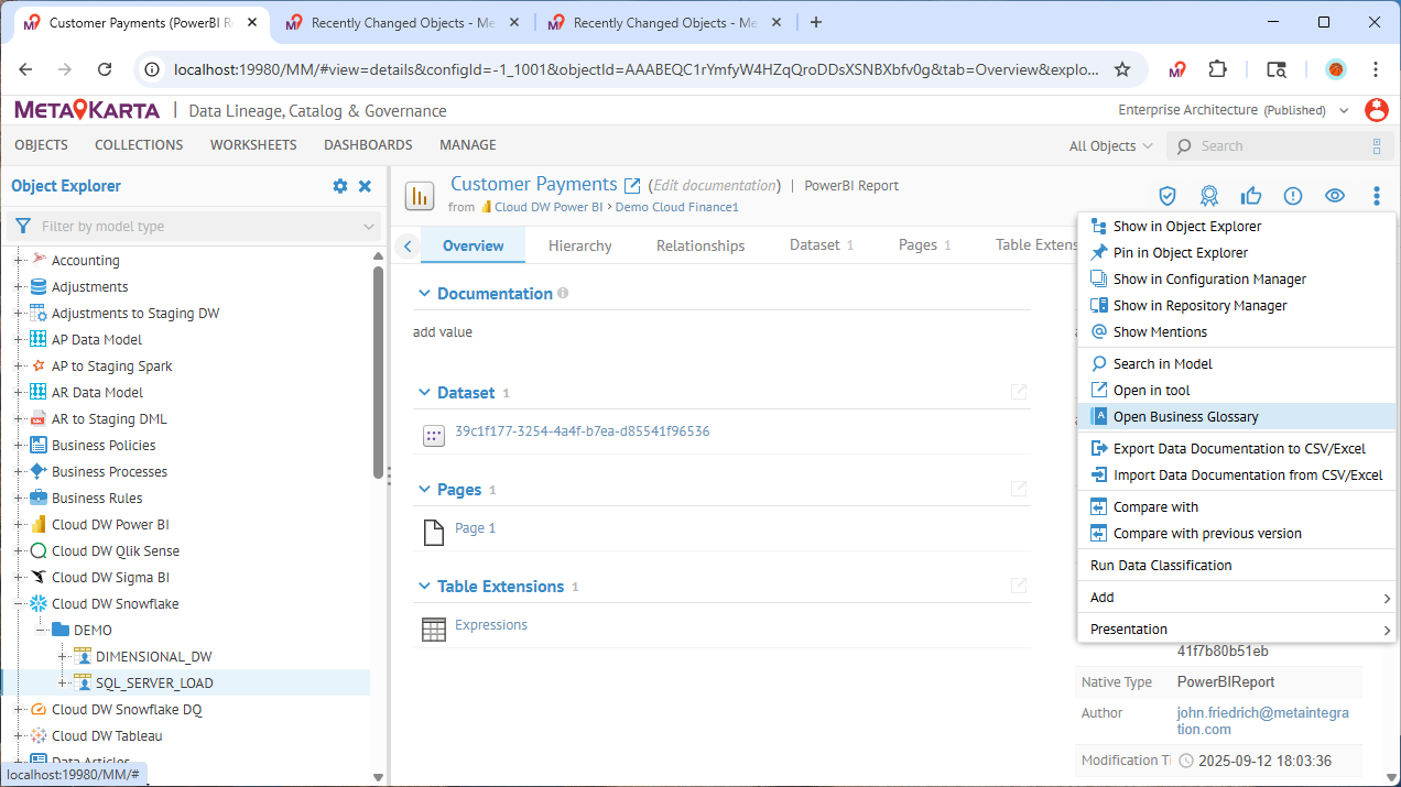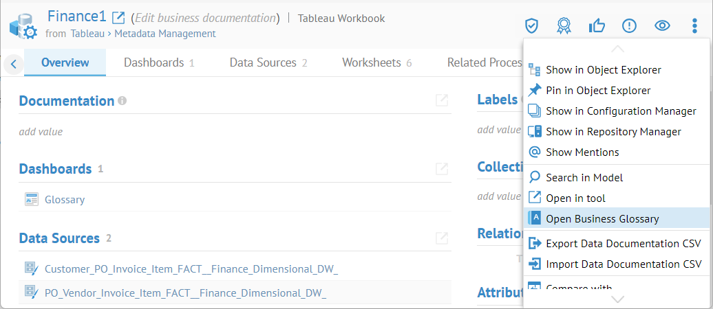 Open Business Glossary provides a report of the glossary terminology that defines (provides a mapped or inferred definition and/or business name of) the fields within the selected object.