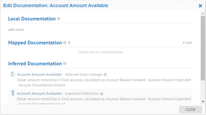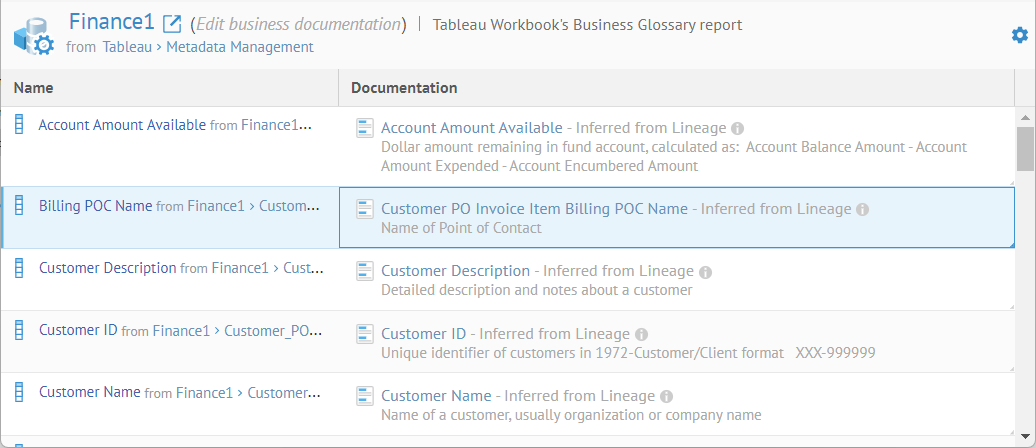 The glossary terms that define each column in the DIMENSIONAL_DW schema is shown as a link, so you may quickly review or update the information (e.g., definition or business name) that then updates the definition of the column. This way, you may quickly identify undocumented object and just as quickly provide a definition or otherwise.