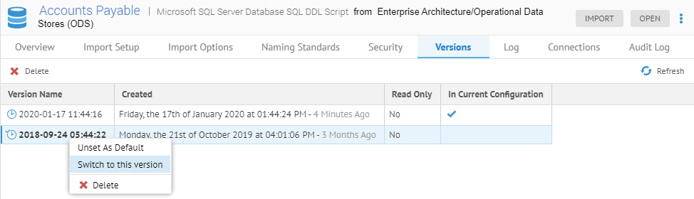 The current version (in bold) in the current configuration that you are viewing is generally automatically updated to include the latest version of a contained model. This automation may be turned off by an Administrator.