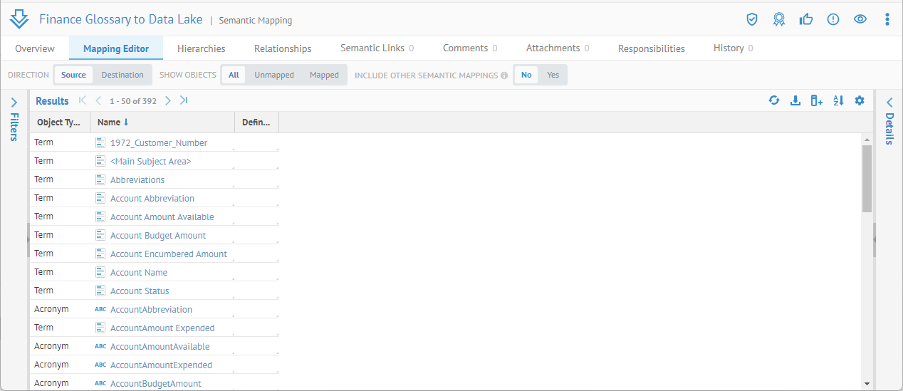 You may always edit the semantic mapping as a whole, instead of adding mapping links in the Lineage tab or in bulk. In this case you will go to the Mapping Editor tab for the mapping, rather than individual objects.