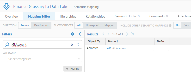 Specify whether to INCLUDE OTHER SEMANTIC MAPPINGS in the list of results. This way you may see already mapped objects even though they are not a part of this semantic mapping. You may not edit them here. Instead, you should edit them from the source or destination object or by going to the other semantic mapping and using the Mapping Editor tab there.