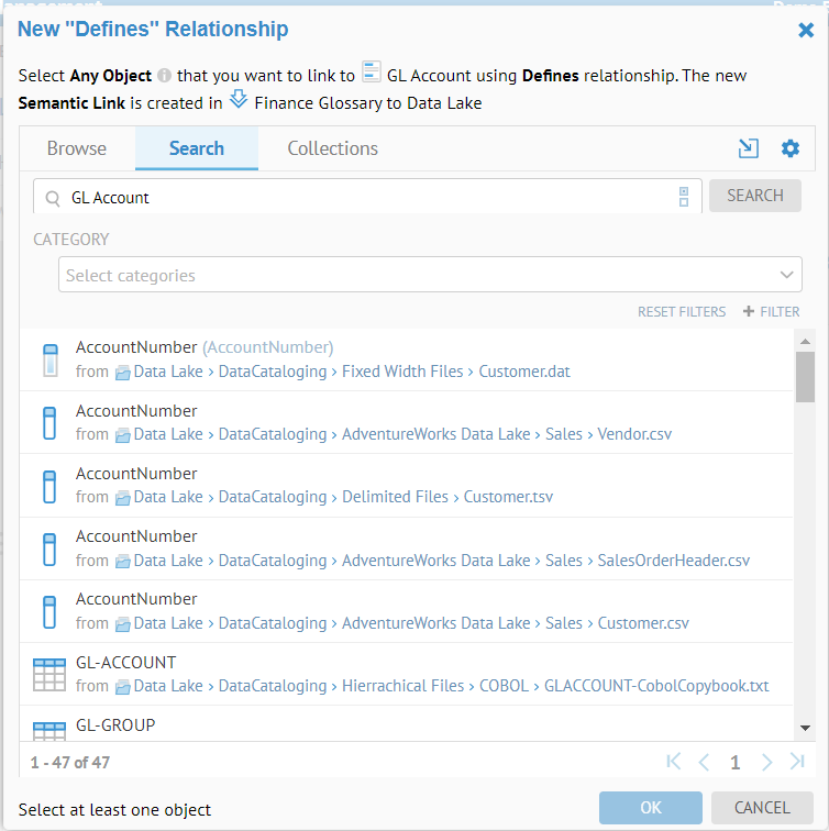 Select GL-ACCOUNT which is a COBOL Copybook element from the data lake and click OK.