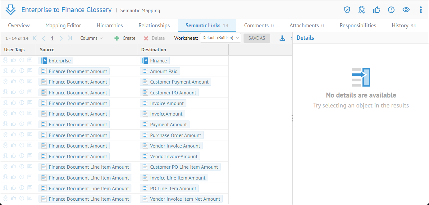 Sign in as Administrator and go to object page for the Enterprise to Finance Glossary semantic mapping. Go to the Semantic Links tab.