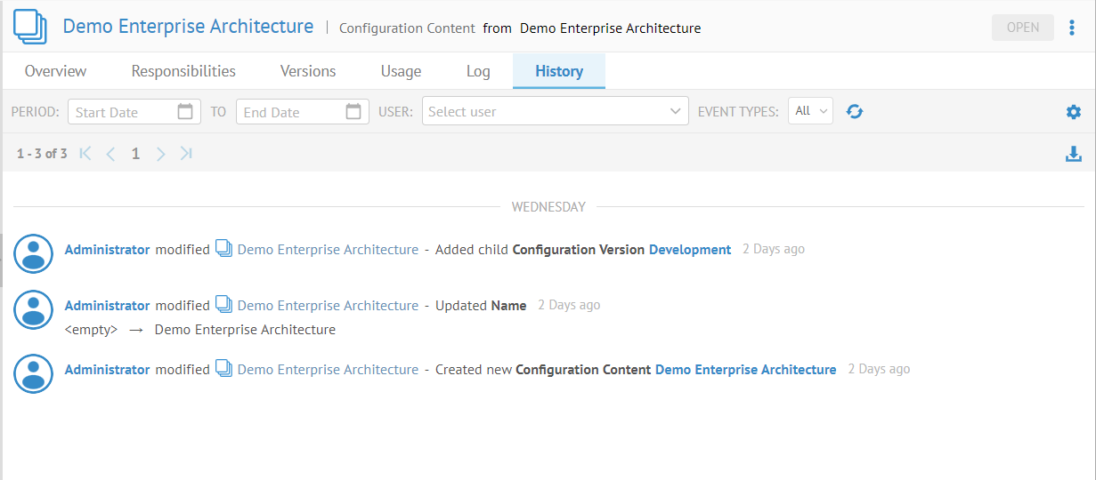 Select the Demo Enterprise Architecture configuration and go to the History tab.