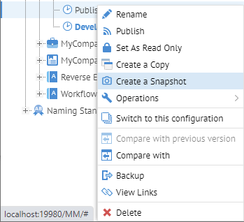 Right-click the configuration version you wish to snapshot and select Create a Snapshot.