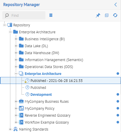 Sign in Administrator and go to MANAGE > Repository. Right-click the Published version of the Demo Enterprise Architecture configuration and select Create a Copy.