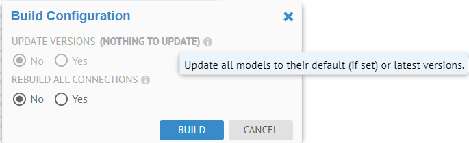Just as you may define configurations for automatic update of new model versions which are contained in that configuration, you may use the Update and build option to do so manually. In this way, for each contained model, the latest version is included in the configuration. Then the configuration is Built as part of the process.
