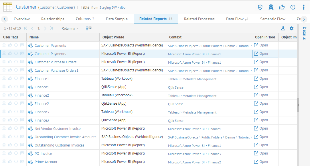The Open option is presented for each report end point and clicking there presents the report in the third-party tool.
